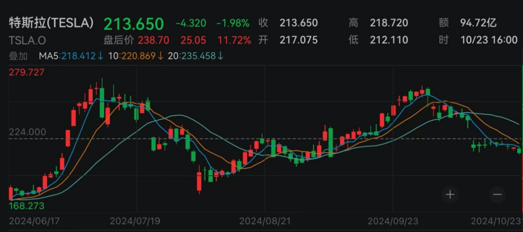 特斯拉跌1.98%,但由于财报表现超预期,股价在盘后大涨超11%。