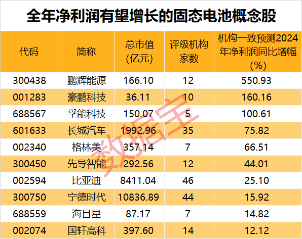今日天奈科技、珈伟新能、江苏国泰等概念股的主力资金净流入额居前。从超5家机构给予评级的固态电池概念股来看,鹏辉能源、豪鹏科技、孚能科技、长城汽车等10股今年全年净利润有望实现同比超10%的增长。